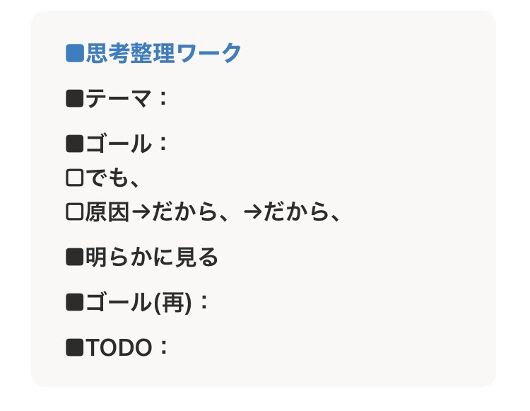 思考の整理は、私の対人支援技術のコアのひとつ。個人セッションで私が直接思考を伴走する際も、私塾で塾生さん自ら思考を巡らせる実践を積んで頂く際にも、下記のようなワークを使っています。